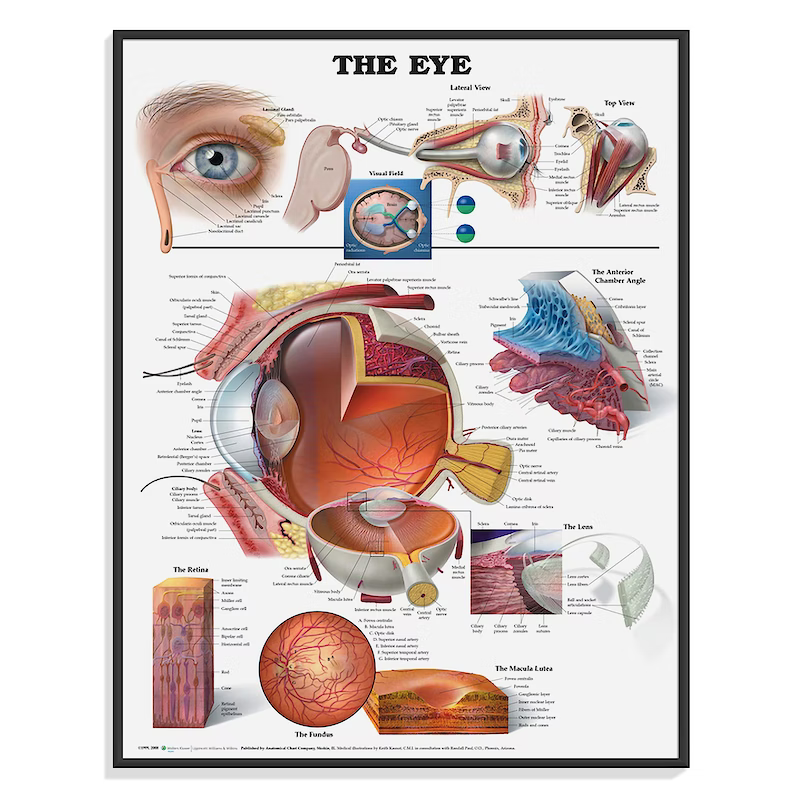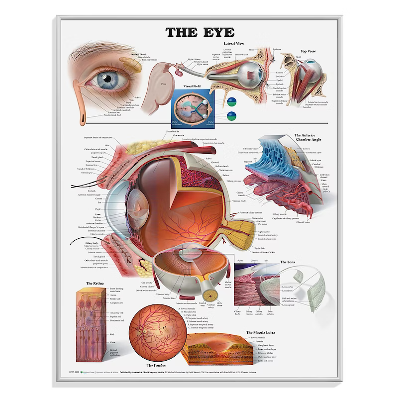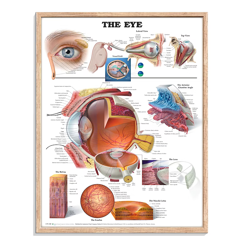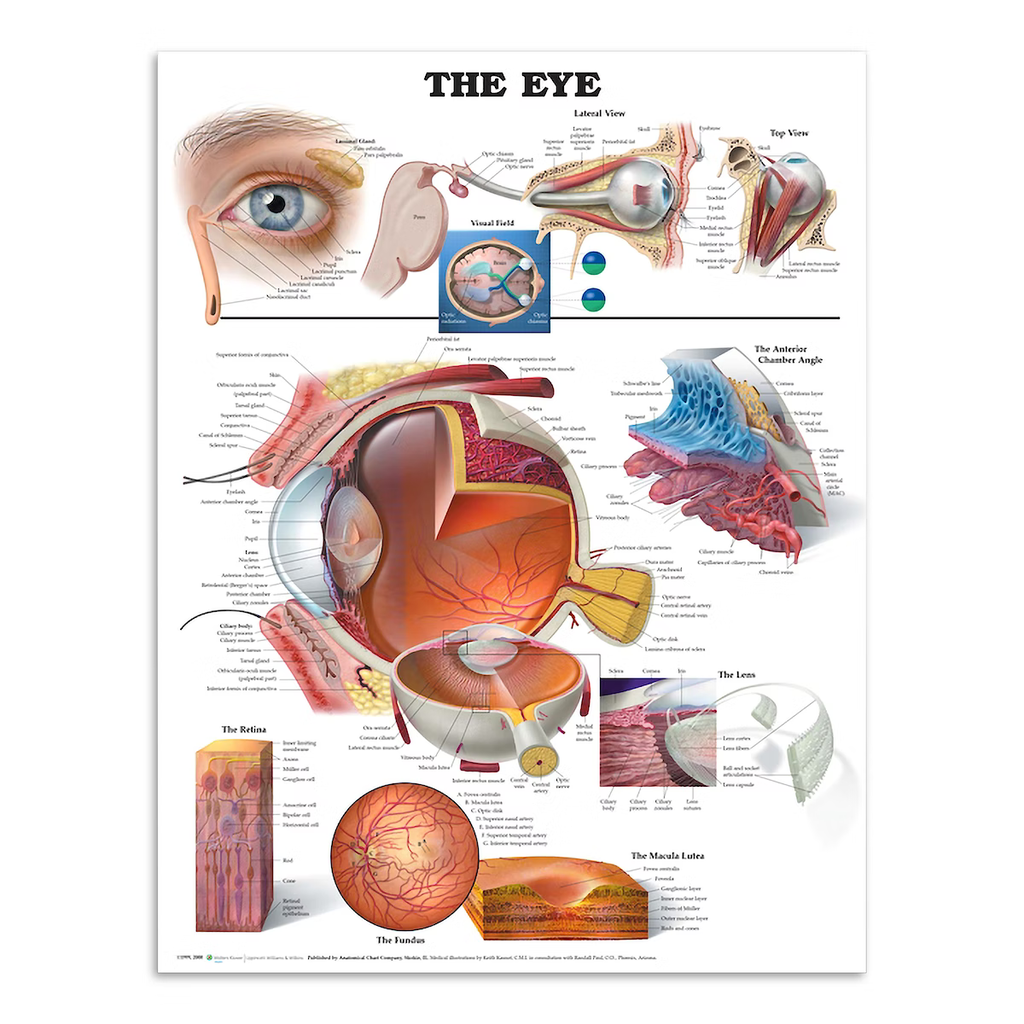 Plakaten / plakaten viser øjen i tværsnit, og også et billede fra oven og et perspektiv, der viser synsfeltet. Det illustrerer den forreste kammervinkel, linse, nethinden, fundus og macula lutea.