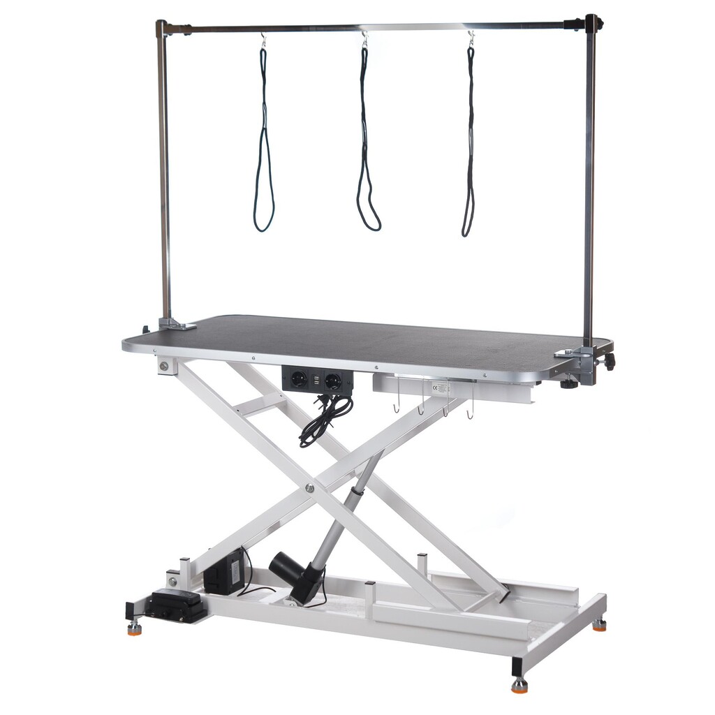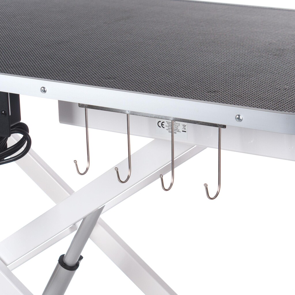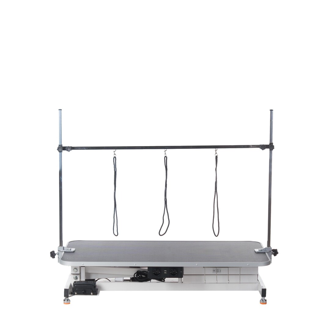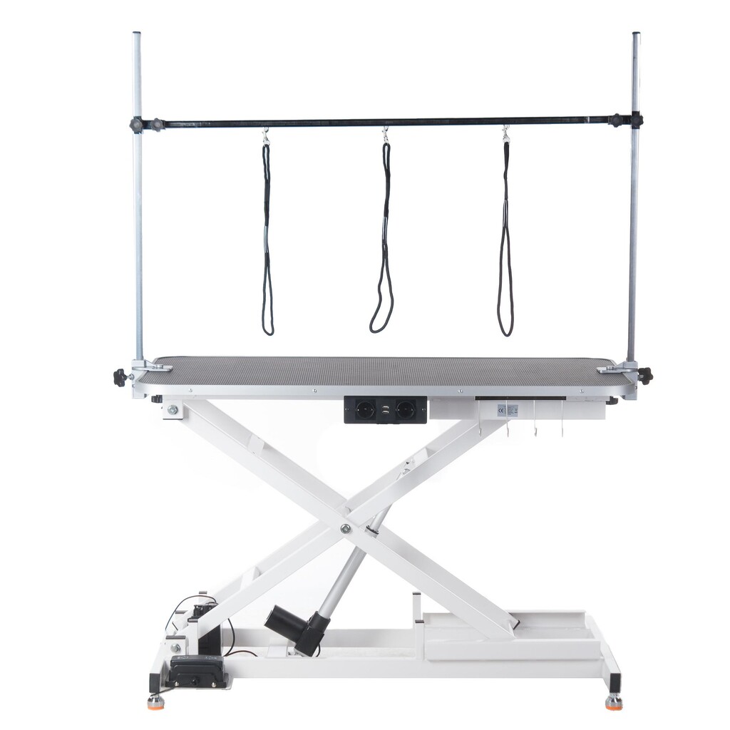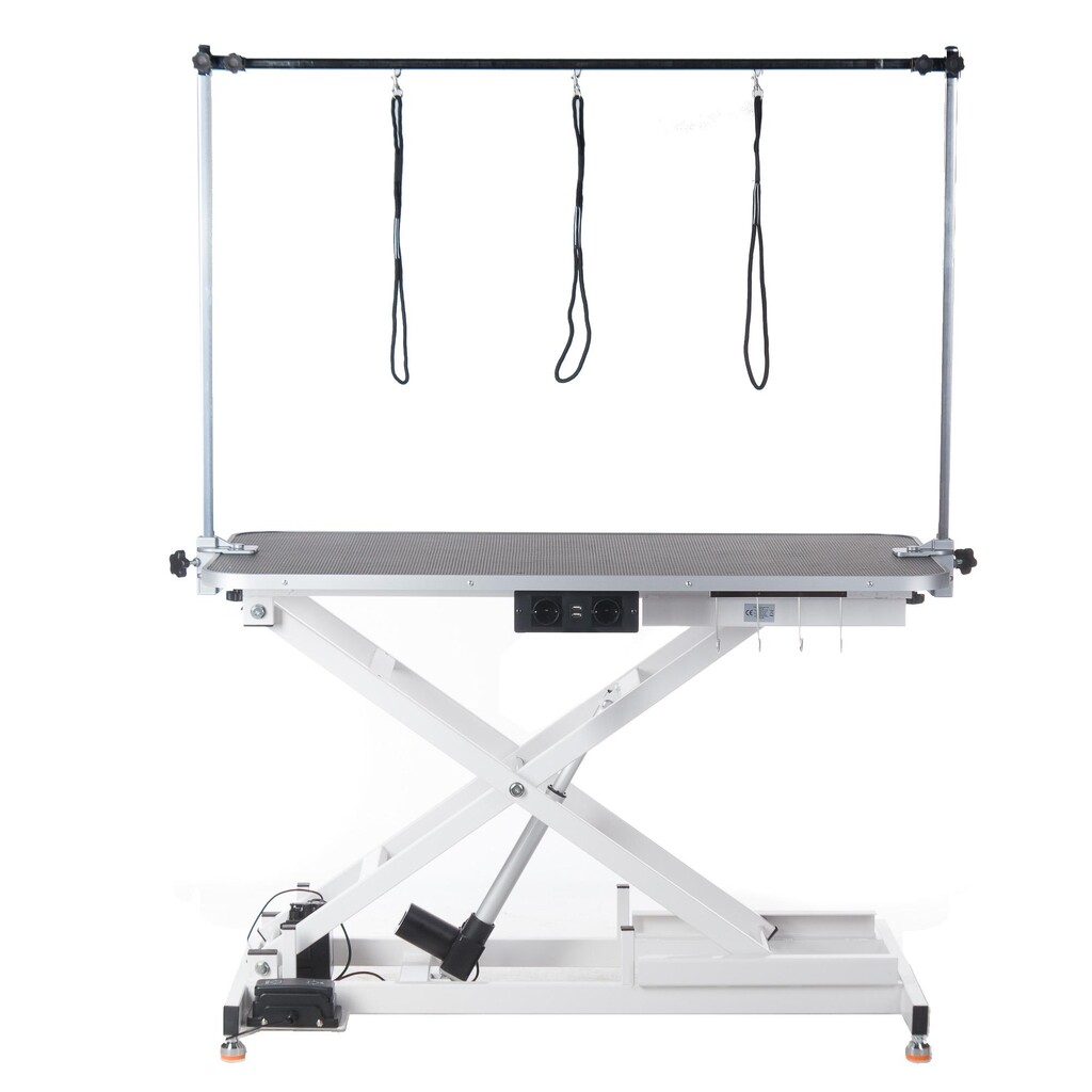 Et XL-bord til kæledyr. Den usædvanligt stabile bordplade er dækket af en sort skridsikker måtte. Stellet er pulverlakeret i hvid. Bordpladens højde er elektrisk justerbar, så du kan tilpasse bordet perfekt til dine behov og dit kæledyrs størrelse. En højdejusterbar tværstang med tre snore medfølger.