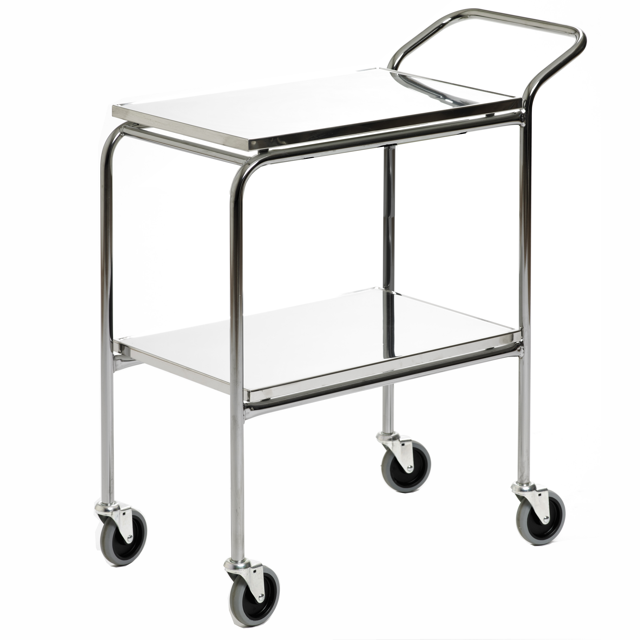 Serveringsvognen er udstyret med to skubbehåndtag, et opretstående for en behagelig kørestilling og et vandret, så vognen kan skubbes ind under en bænk. Fås også i en version med to vandrette skubbehåndtag mod merpris. Hylderne er lavet af plastlaminat eller rustfrit stål. Skiverne hviler på afstandsstykker for lettere rengøring mellem skiven og stativet.