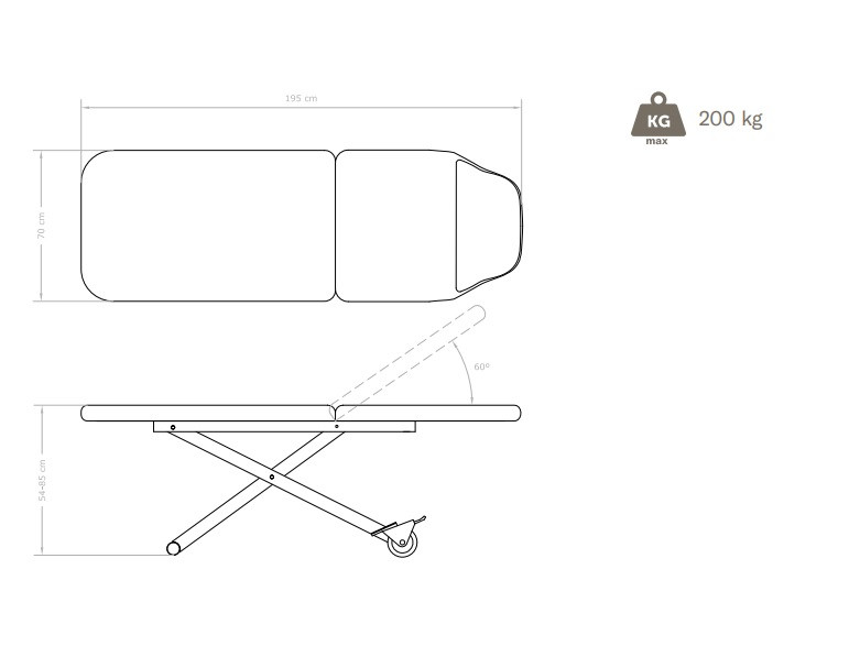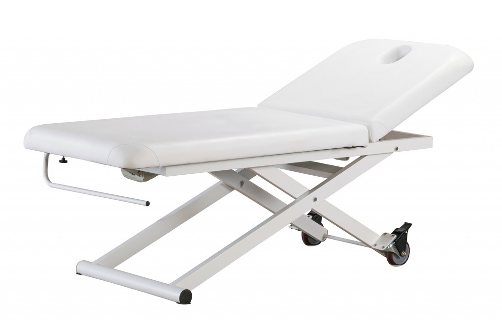 2 delt bunk indstillelig i højden gennem 1 motor, ryglæn vinkel justerbar ved hjælp af en gas lift. Robust metalramme med to hjul for nem bevægelse.Hvid høj kvalitet PU polstring og nem rengøring.